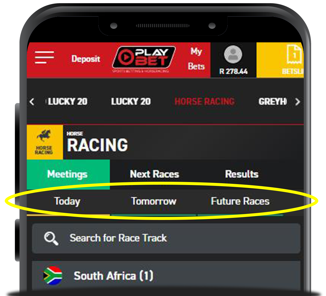 Below the Meetings, Next Race and Results menu, you can choose to bet on Today's bets, Tomorrow or Future Races.